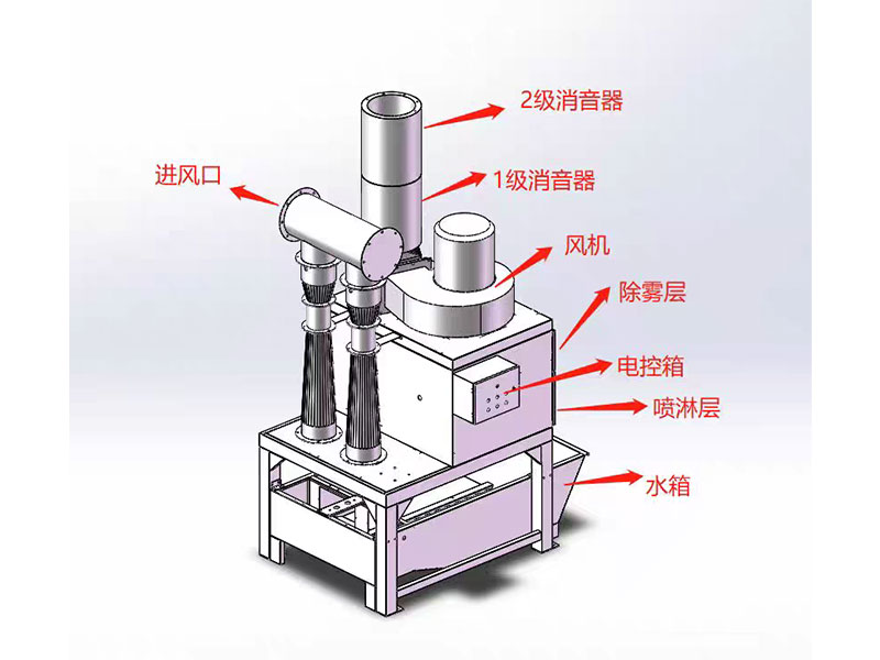 排出至本系統的預排塵箱。余下含有細顆粒的空氣進入正式水霧除塵的后續處理,